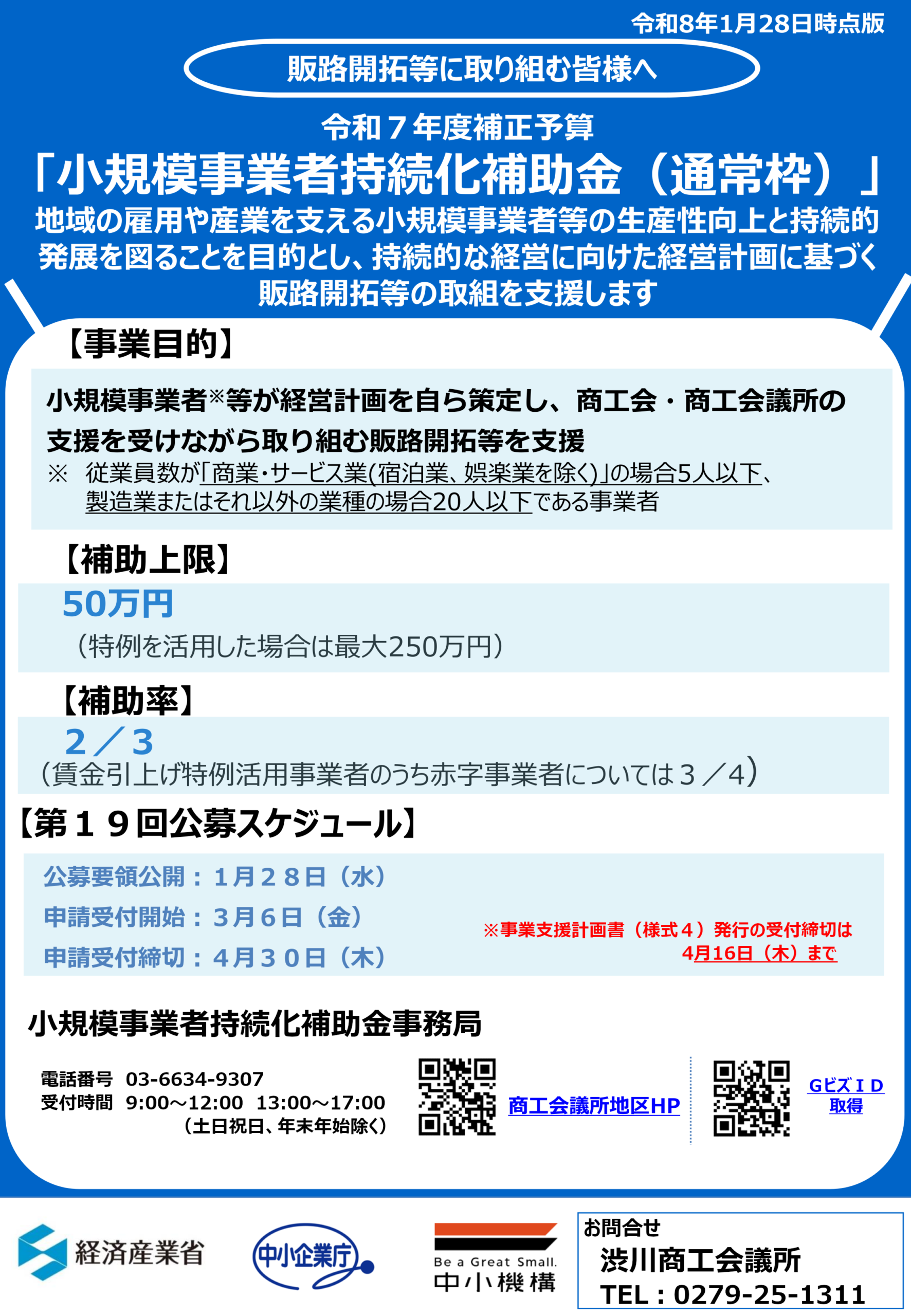 | 2026.1.28 国 | 第19回小規模事業者持続化補助【一般型】の公募要領が公開されました ※確認書の発行は4/16まで |
